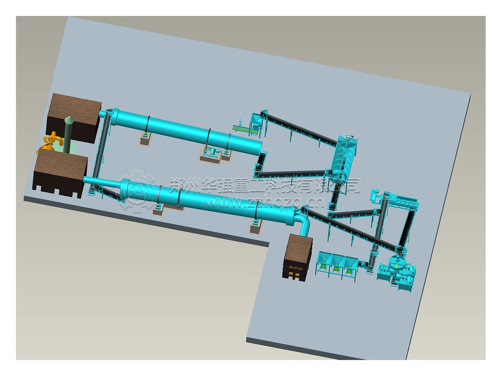 輪盤式發(fā)酵翻推機——配料系統(tǒng)——半濕物料粉碎機——雙軸攪拌機——除塵器——組合造粒機——烘干機——冷卻機——滾筒篩分機——包膜液電加熱熔爐攪拌罐——自動包裝。