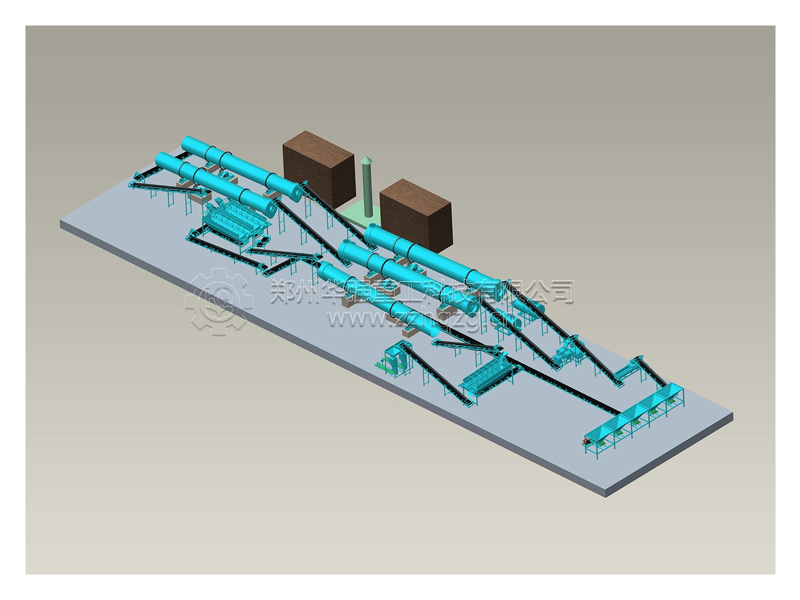 生物有機(jī)肥生產(chǎn)線用于生物肥料的生產(chǎn),以有機(jī)質(zhì)為主,纖維素多、成形條件差,并添加有造肥功能的活細(xì)菌群、生產(chǎn)過程以不宜接觸高溫等特點(diǎn)。造料方式上采用園盤造粒、擠壓和新型造粒方法,因?yàn)檫@三種工藝,要求原料的粉碎細(xì)度高,造粒水分高,一般含水量要達(dá)到30%左右,成開后顆粒含水量低,烘干的負(fù)荷很小,可以減少有效細(xì)菌的損失,粉塵小,操作環(huán)境較好。原料進(jìn)入造粒機(jī)中,加入適量的水或蒸汽、粘結(jié)成粒,造粒后物料通過皮帶機(jī)送入烘干機(jī)進(jìn)行干燥。顆粒直徑為3.0-4.0mm,成粒率大于70%。生物肥料的生產(chǎn)過程中,不僅成形后顆粒含水量一般都要超過指標(biāo),需要低溫烘干,而且有機(jī)質(zhì)原料經(jīng)發(fā)酵后,含水量約為30%~40%,成粒后顆粒水份一般在15%~20%之間,肥料質(zhì)量指標(biāo)要求含水量低于14%,需進(jìn)行烘干處理。因此干燥工段是生物肥料生產(chǎn)過程中不可缺少的重要工序,直接影響產(chǎn)量、質(zhì)量和能耗,合理選擇干燥機(jī)的型號規(guī)格,控制的工藝條件是非常重要的。在烘干機(jī)前部設(shè)有一段二次造粒區(qū),物料在此區(qū)間可實(shí)現(xiàn)二次造粒。然后經(jīng)揚(yáng)料板將物料揚(yáng)起實(shí)行充分干燥,烘干機(jī)尾部通過抽風(fēng)機(jī)經(jīng)管道將濕潤的熱空氣抽出,進(jìn)入沉降室沉降,尾氣在通過沉降后經(jīng)過洗滌塔實(shí)行噴淋降塵,噴淋水由水泵抽出循環(huán)使用,經(jīng)過二次降塵處理后,符合國家標(biāo)準(zhǔn)的尾氣經(jīng)煙囪排入大氣。