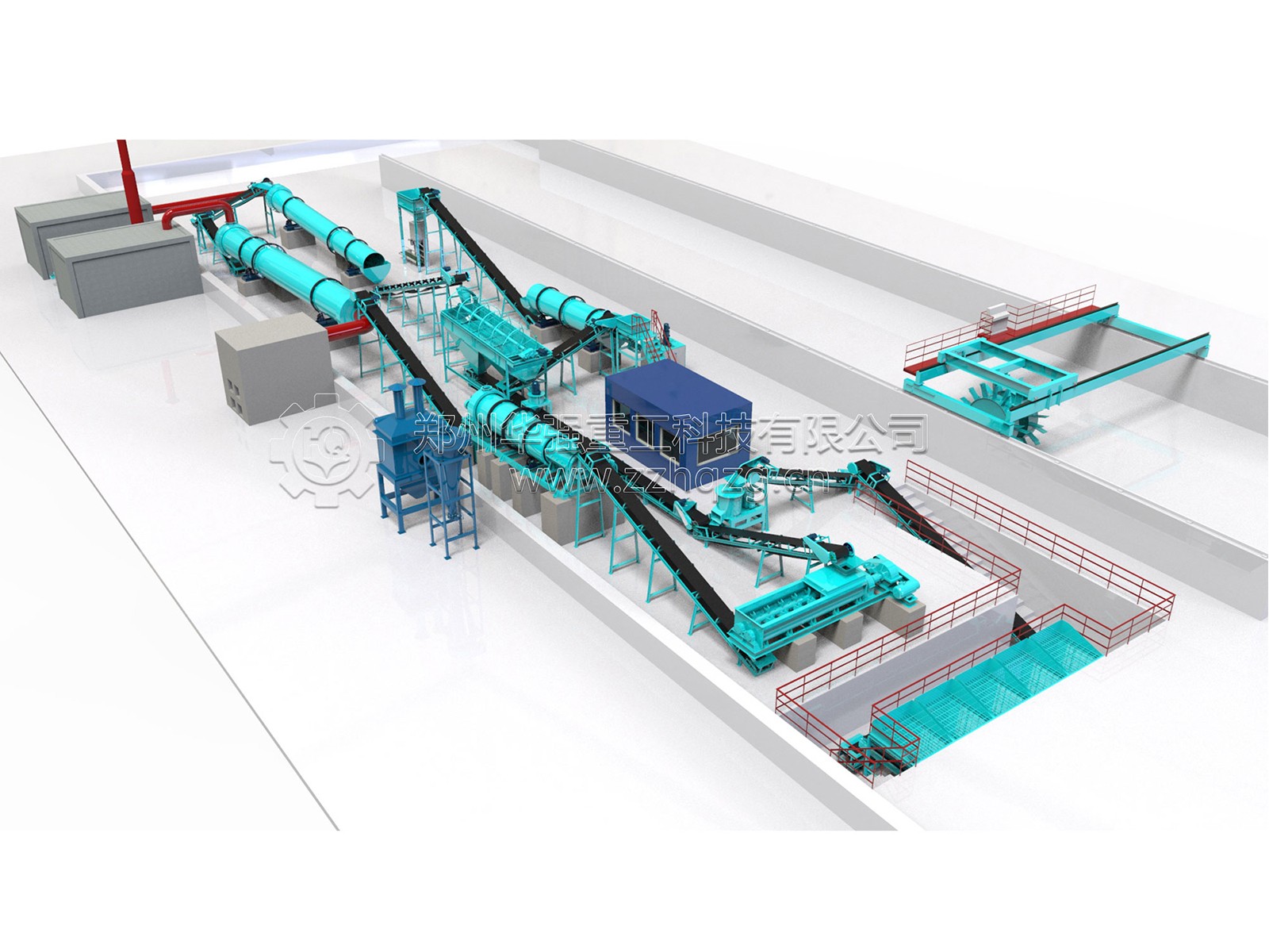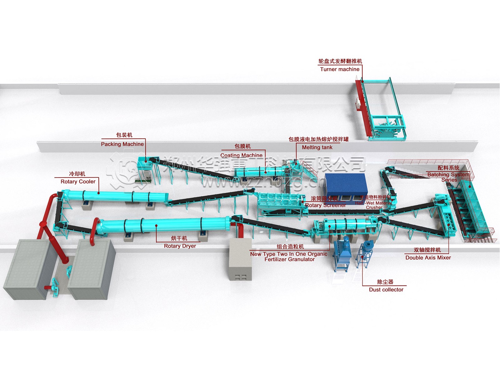 輪盤式發(fā)酵翻推機——配料系統(tǒng)——半濕物料粉碎機——雙軸攪拌機——除塵器——組合造粒機——烘干機——冷卻機——滾筒篩分機——包膜液電加熱熔爐攪拌罐——自動包裝。