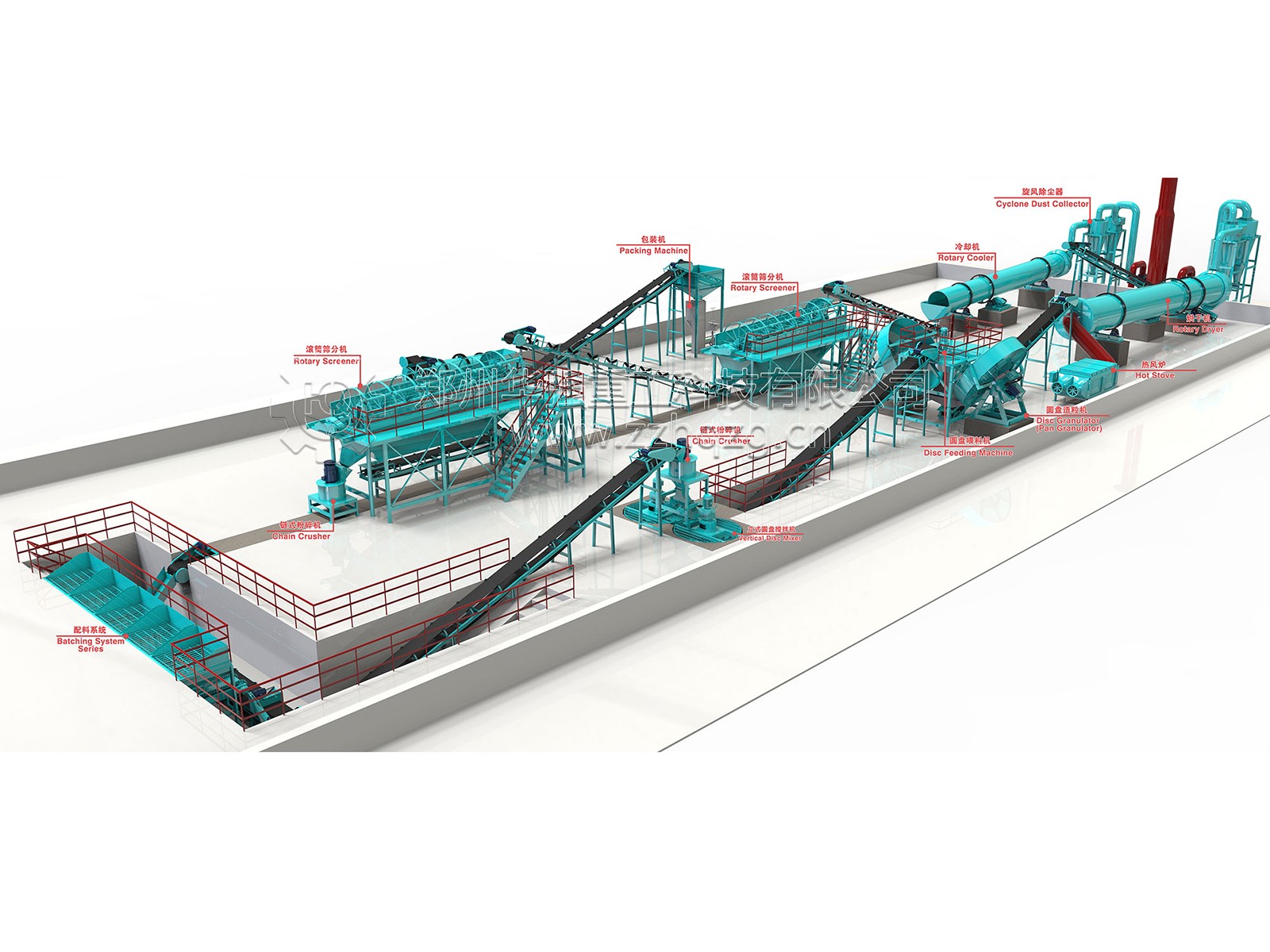 配料系統(tǒng)——鏈?zhǔn)椒鬯闄C——立式圓盤攪拌機——圓盤喂料機——圓盤造粒機——熱風(fēng)爐——烘干機——旋風(fēng)除塵器——冷卻機——滾筒篩分機——滾筒篩分機——鏈?zhǔn)椒鬯闄C——自動包裝機。